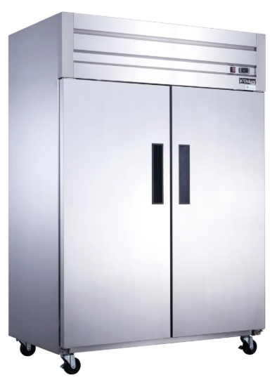 D55AF Commercial 2-Door Top Mount Freezer in Stainless Steel The Dukers D55AF reach-in commercial freezer is designed to suit the needs of any business who needs optimal performance without sacrificing design. Its’ two doors are accented with high-quality brushed stainless steel for both the interior and exterior to fit a variety of decors. Recessed door handles allow for clean styling and better ergonomics. The heavy-duty 1 HP compressor is top mounted for excellent efficiency and better cooling. Digital controls fine-tune the desired interior temperature. Self-closing doors free up your hands for added convenience and ease of use. Auto-defrosting provides lower energy costs and colder temperatures. The included 8 shelves can be adjusted or removed for flexibility and maintenance. Easily move and position with four swivel casters. Description The Dukers D55AF reach-in commercial freezer is designed to suit the needs of any business who needs optimal performance without sacrificing design. Its’ two doors are accented with high-quality brushed stainless steel for both the interior and exterior to fit a variety of decors. Recessed door handles allow for clean styling and better ergonomics. The heavy-duty 1 HP compressor is top mounted for excellent efficiency and better cooling. Digital controls fine-tune the desired interior temperature. Self-closing doors free up your hands for added convenience and ease of use. Auto-defrosting provides lower energy costs and colder temperatures. The included 8 shelves can be adjusted or removed for flexibility and maintenance. Easily move and position with four swivel casters. Commercial freezer with spacious capacity Stainless steel interior and exterior for durability Digital temperature controls with LED display for precise adjustment Temperature range from 0 to -8°F (approx.) Ambient temperature: 100.4°F Overall dimensions (W x D x H): 55 1/8″ x 32 5/8″ x 80 3/8″ Automatic defrosting 8 adjustable and removable wire shelves (4 on each side) Recessed door handle for clean styling 4 locking swivel casters for easy moving and positioning (5”) Interior light to illuminate food and other items Heavy-duty 1 HP top mounted compressor Energy Star Certified to meet strict energy performance standards set by EPA NSF/ANSI 7 Standard for Commercial Refrigerators and Freezers ETL Listed / ETL Sanitation Commercial refrigerator comes with NEMA 5-20P plug for simple plug-in installation 115V/60Hz, 14 Amps, 1250 watts, 9 ft. power cord R290 Natural Refrigerant 3 Year Parts & Labor Warranty 5 Year Compressor Warranty