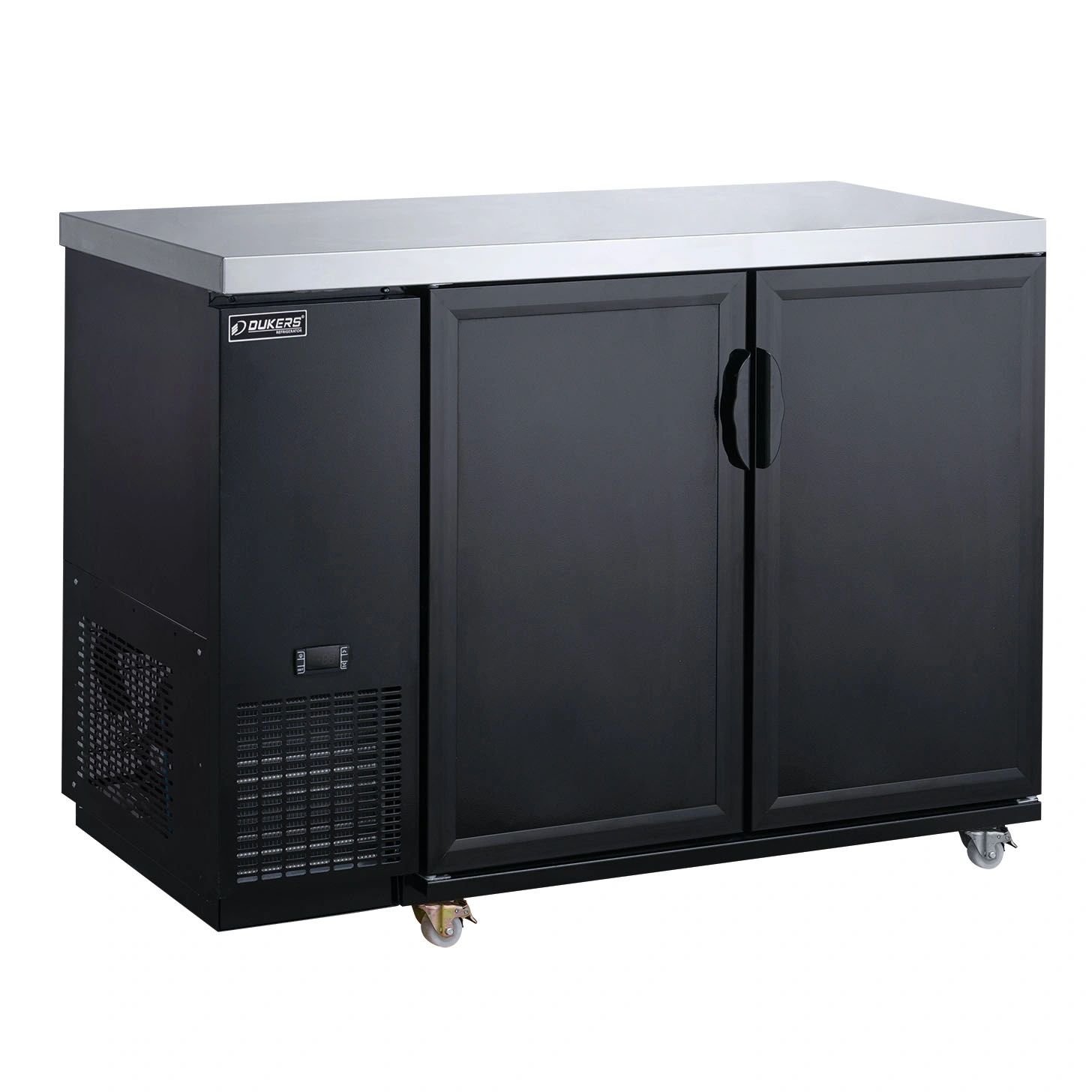 Dukers 48″ Back Bar Cooler Refrigerated Back Bar Cooler, reach-in, two-section, 49-1/5″W, self-contained side mount refrigeration, digital temperature control, 33°F to 38°F temperature range, automatic defrost, (2) lockable hinged tempered glass doors, (4) adjustable shelves, interior LED light with switch.